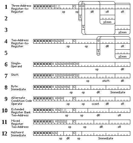 A three-address register-to-register operate instruction is shown in lines 1 through 3; either one of the source and operand registers may be replaced with pointers to pseudo-immediate operands. As the result of the instruction would be a constant if both of those operands were so replaced, this combination is illegal, and the bit pattern it would have is reserved for future expansion of the instruction set.