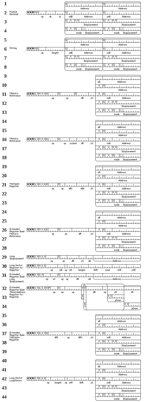 Also note the presence of a bit marked as S. This bit is used to indicate scaled indexing; if the instruction is indexed, and the type of operand of the instruction is other than byte, the value in the index register is shifted left before use by as many places as appropriate so that the index is in units of the operand length; one place for halfwords, two places for integer and floating values, three places for long and double values, and four places for quad values. In the case of Medium floating-point operands, a shift of one place to the left is applied in accordance with their alignment, as opposed to attempting to multiply by six during address calculation.