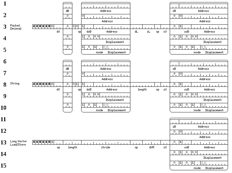Note that among the memory reference instructions shown in lines 9 through 13, there are memory-to-register operate instructions, which is why a C bit is present, some of which are included in the 32-bit instruction set as supplemental memory-reference instructions of the second kind, and there are memory-to-registers acting on types of data other than the most basic types, some of the load and store instructions among which are included in the 32-bit instruction set as supplemental memory-reference instructions of the first kind.
