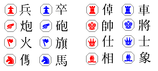 Chinese chess, or Hsiang ch'i (Xiang Qi), is shown using Western chess symbols at right for ease of explanation. As the pieces in actual sets are disks labelled with Chinese characters, a key to those characters appears below: