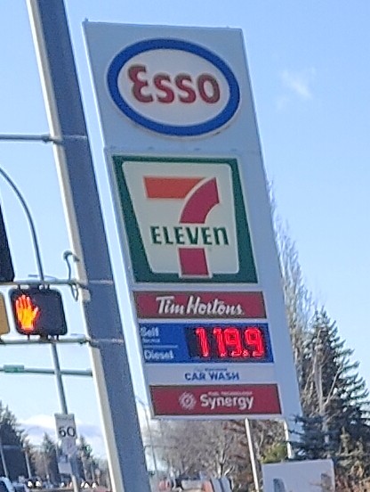 And for the American viewers of this page for whom the photo is primarily intended, it should be noted that the price of gasoline noted on the sign, 119.9 cents, is per litre, and not per gallon, a litre being slightly smaller than the British Imperial quart formerly in use in Canada, but slightly larger than the quart in the U. S. Customary system of units.
