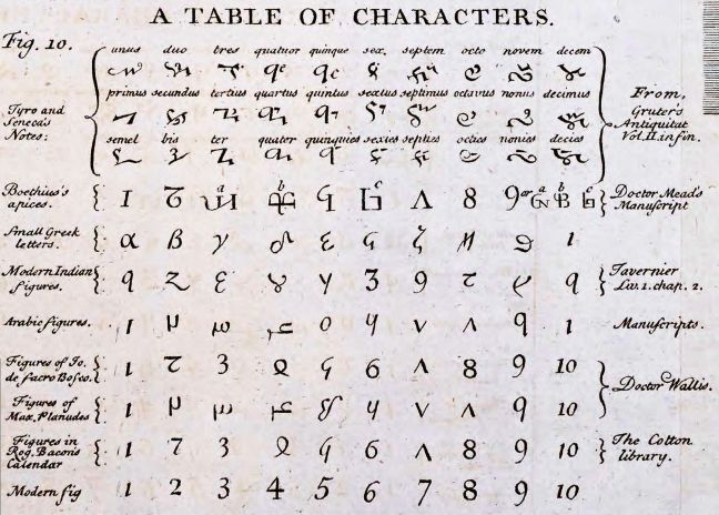 And here's another old table of the forms the digits have taken, this one casting about widely for possible origins, examining Greek letters and the Tironian notes: