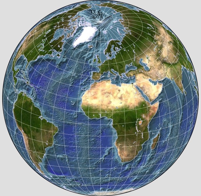 The viewpoint used in this map is that from the orbit of a geosynchronous satellite, such as is used for satellite television, the specific distance given being 35,900 kilometres above the surface of the Earth.