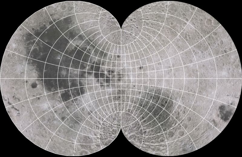 Another case where all parts of the map are equally important, so that the Eisenlohr would be preferred to the August conformal, is for maps of other celestial bodies, such as the Moon or Mars. So here is a map of the Moon on the Eisenlohr projection: