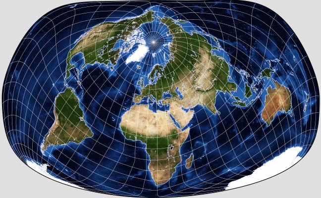 has its x and y coordinates calculated as polynomial functions of the latitude and longitude where the coefficients were chosen to minimize the area and shape errors of the projection: that the pole-line circles around to touch itself is an interesting and unusual feature of this projection.