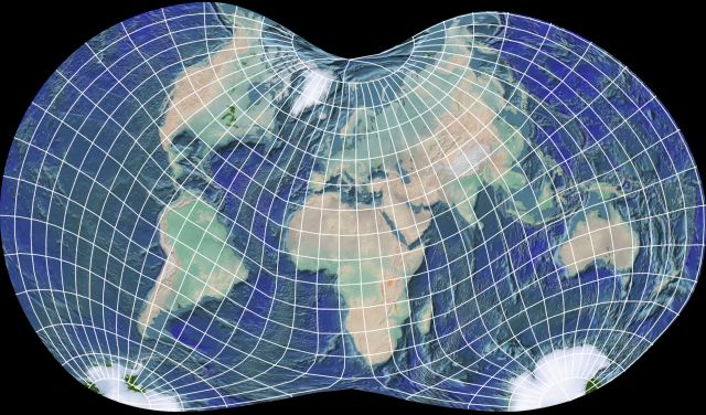 After locating the paper in which this projection was described, in the summer 1989 issue of Cartographia (volume 26, number 2, pp. 53-71), I discovered, though, that I abused the projection, as it was optimized for distortion only over the land masses, as they would appear with the projection centered at 0 degrees longitude, not at 10 degrees East longitude, as I have consistently used for conventional world maps to avoid interrupting Siberia.