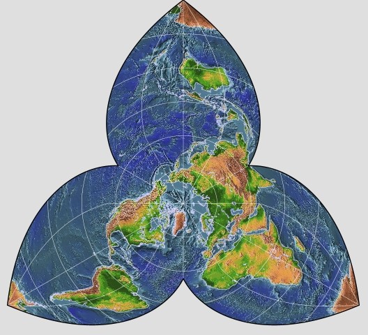 I think that this particular interrupted projection could be the basis for a very attractive map, along the lines of the illustration below: