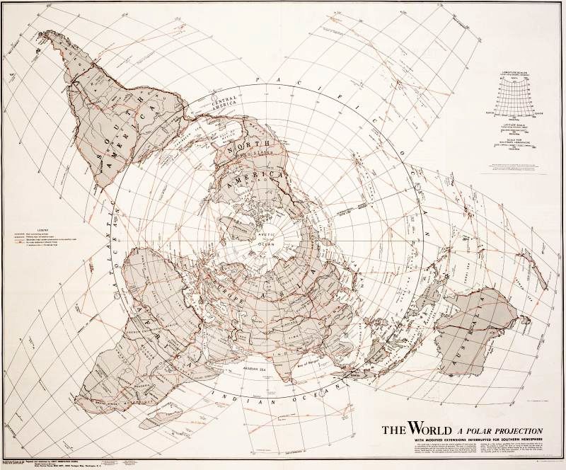 This map dates from 1943, and was used by the U.S. military. Unlike the two previous examples, the Southern Hemisphere portions aren't symmetrically distributed, but are instead chosen to minimize distortion for each of the continents that extend into the Southern Hemisphere.