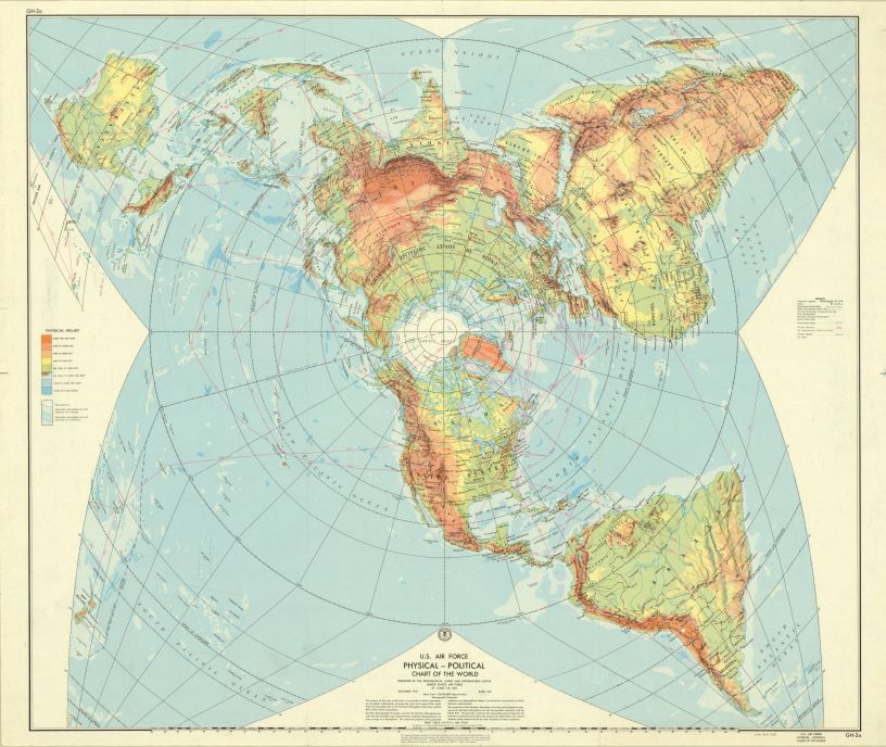drawn for the U.S. Air Force, uses the Stereographic projection for its central portion. The lobes for the Southern hemisphere can thus be on the Bonne's projection without widening; however, in this case, their standard parallel would, in effect, lie somewhere north of the North Pole. (The Super-Werner's projection, anyone?) Incidentally, I have retouched the image shown above.