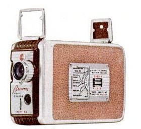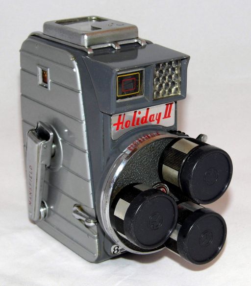 And so if I am going to mention still-picture cameras of various kinds, should I not also mention motion picture cameras? But except for one mention of Polavision, motion picture cameras are completely ignored in the following pages. So, here on this first page, I will mention a very few such cameras. Depicted at left is the Brownie 8mm camera from Kodak, and at right the Holiday II 8mm camera from Mansfield.