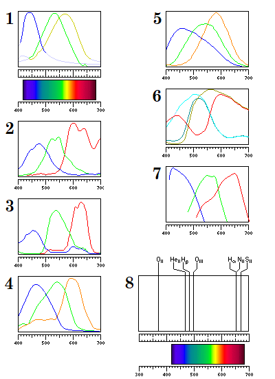 Even having eight different response curves to play with does not allow some linear combination of them to match, exactly, from one end of the spectrum to the other, to match either the response curves of the three pigments of the eye, or the response curves of the three psychovisual stimuli used in the CIE chromaticity model. Given that, what is the point? Isn't it a case of diminishing returns?