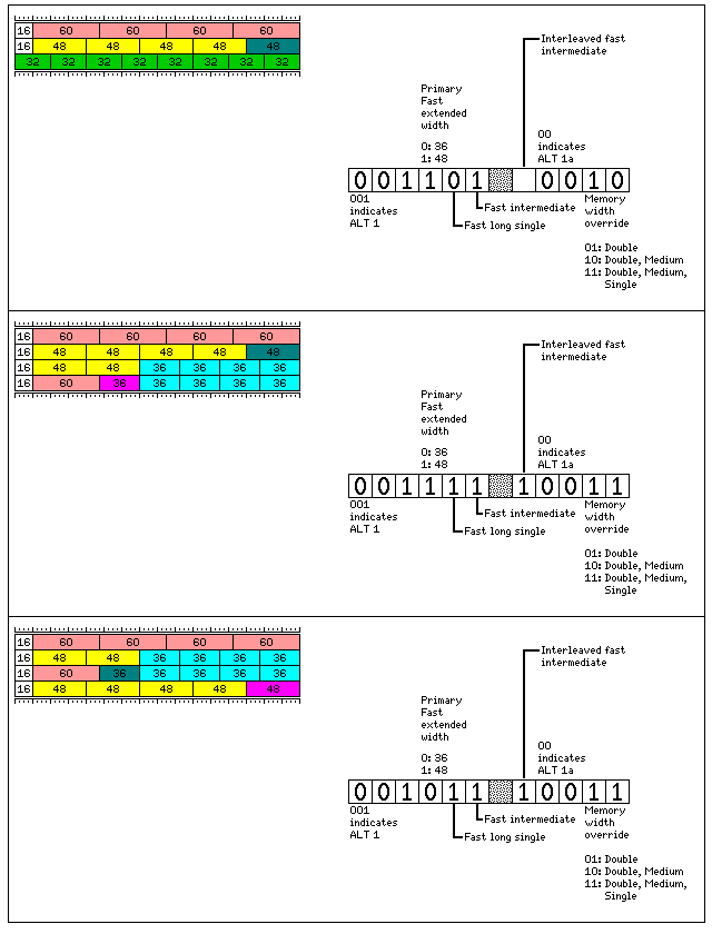 As well, note that memory width override is used for double precision, even though its length is not modified by the fast long single, fast intermediate, or fast extended modes. This is in order to ensure that double precision continues to act conventionally, so that it can be used to access the left-over space in a 256-bit memory unit. In this way, a program that accesses a limited amount of character or fixed-point data which does fit in cache may use data memory width control so that this data can be of an unconventional length, while using this feature instead to facilitate alternate lengths of floating-point data which is in large arrays that will not make optimal use of cache.