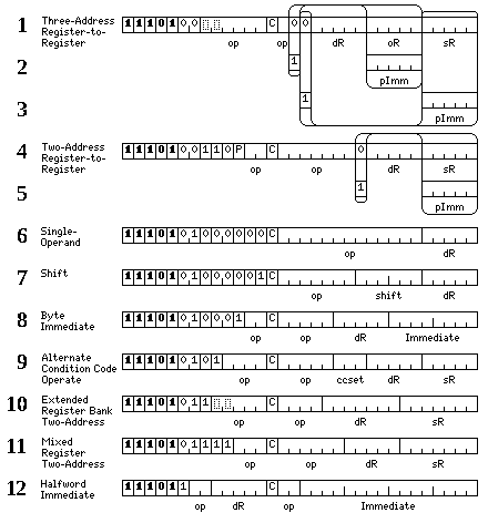 A three-address register-to-register operate instruction is shown in lines 1 through 3; either one of the source and operand registers may be replaced with pointers to pseudo-immediate operands. As the result of the instruction would be a constant if both of those operands were so replaced, this combination is illegal, and the bit pattern it would have is reserved for future expansion of the instruction set.
