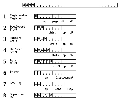 M MULTIPLY Multiply the contents of the source and destination locations, placing the least significant part of the result of the same length as the two input operands in the destination location, with sign extension if that is shorter than the length of the destination register D DIVIDE Divide the contents of the source location by the contents of the destination location, placing the quotient in the destination location L LOAD Place the contents of the source operand in the destination register; if the type involved is smaller than the register, perform sign extension ST STORE Fill the destination location from the least significant part of the source location A ADD Add the contents of the source and destination locations, placing the result in the destination location S SUBTRACT Subtract the contents of the source location from those of the destination location, placing the result in the source location SW SWAP Exchange the contents of the source and destination locations C COMPARE Subtract the contents of the source location from the contents of the destination location, but with the operation modified so that overflow cannot possibly result, and set the condition codes appropriately without modifying the destination location I INSERT Fill the least significant bits of the destination register with the contents of the source location, leaving the rest of the destination register unaffected UL UNSIGNED LOAD Fill the least significant bits of the destination register with the contents of the source location, and clear the remaining more significant bits of the destination register X EXCLUSIVE OR Perform a bitwise Exclusive OR operation between the contents of the source and destination locations, placing the result in the desination location N AND Perform a bitwise Logical AND operation between the contents of the source and destination locations, placing the result in the desination location O OR Perform a bitwise Logical OR operation between the contents of the source and destination locations, placing the result in the desination location ME MULTIPLY EXTENSIBLY Multiply the contents of the source and destination locations. Take the full product, as an integer having twice the size as that of the source and the destination, and: - in the case of the halfword and integer versions of the instruction, place it in the destination register, with sign extension in the halfword version; - in the case of the long version of the instruction, place the most significannt half of the result in the destination register, which must be an even-numbered register, and place the least significant half of the result in the register following DE DIVIDE EXTENSIBLY Divide a destination operand of twice the length of that indicated by the instruction type (and located as the result of the MULTIPLY EXTENSIBLY instruction) by the source operand; store the double length quotient in the destination location (again following the MULTIPLY EXTENSIBLY result placement) and the single length remainder in the next register following those that are used. Whenever a result is not wide enough to fill a register, sign extension is performed. Division is performed giving a result as if both operands were converted to positive numbers before starting, with the signs then set afterwards to give a correct result based on the actual signs of the operands. Thus both the quotient and the remainder will be positive or zero if the dividend and divisor have the same sign, and both will be negative or zero if they are of opposite signs.