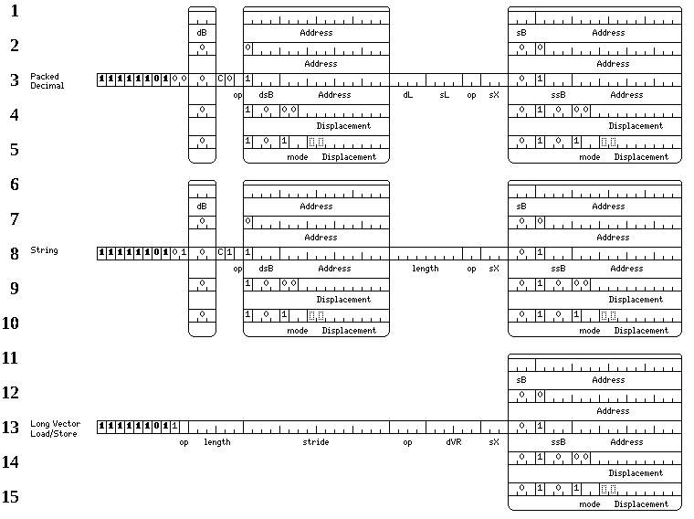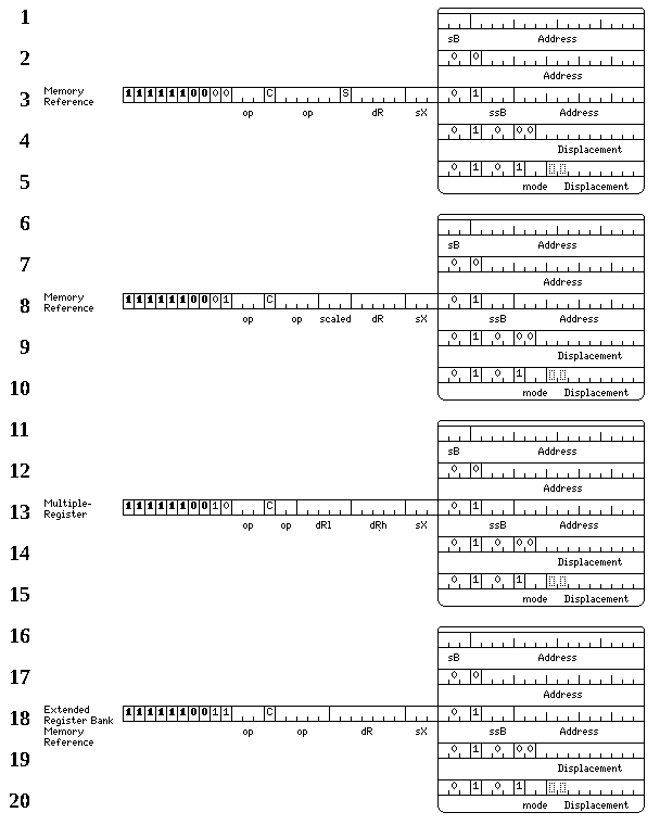 Note that among the memory reference instructions shown in lines 9 through 13, there are memory-to-register operate instructions, which is why a C bit is present, some of which are included in the 32-bit instruction set as supplemental memory-reference instructions of the second kind, and there are memory-to-registers acting on types of data other than the most basic types, some of the load and store instructions among which are included in the 32-bit instruction set as supplemental memory-reference instructions of the first kind.