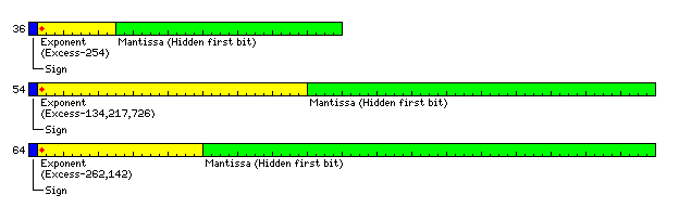 So, if a conventional 64-bit floating-point floating-point number uses one bit for the sign, 11 bits for an excess-1,024 exponent (or, in the case of IEEE-754, 11 bits for what I would term an excess-1,022 exponent, although the standard, putting the implied radix point of the mantissa, which it terms the significand, after the hidden first bit, speaks of it as an excess-1,023 exponent), and the remaining 52 bits for the mantissa, one could imagine that an intermediate-precision floating-point number which also occupies 64 bits could use one bit for the sign, 23 bits for the exponent, and 40 bits for the mantissa, thereby providing 12 digits of precision.