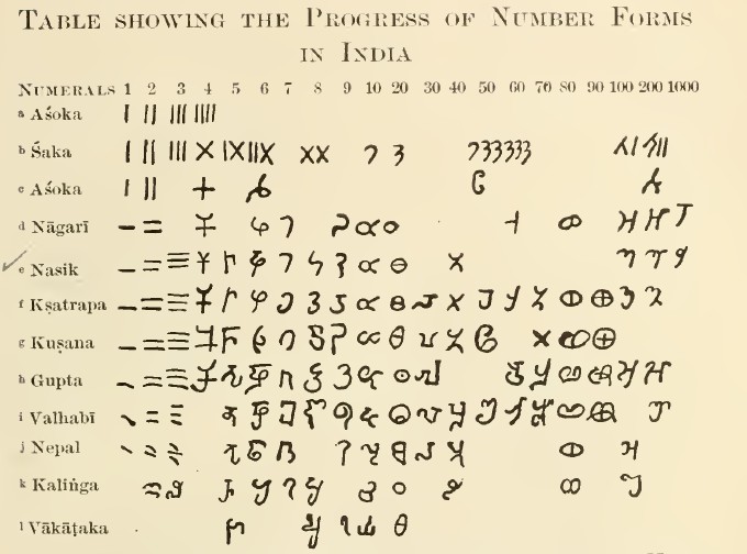 And here's another old table of the forms the digits have taken, this one casting about widely for possible origins, examining Greek letters and the Tironian notes: