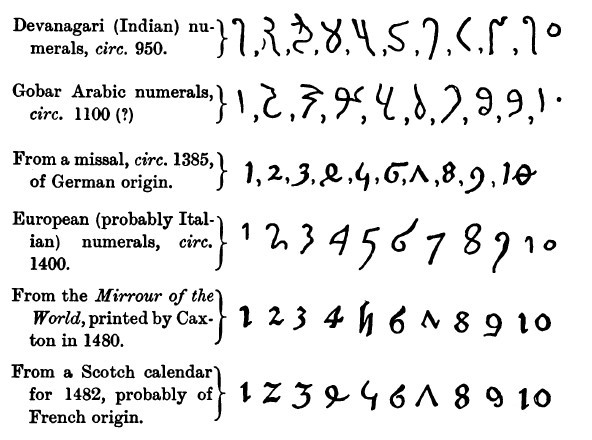 Here, to add further information on this topic, is an illustration of the course of development of our modern digits from an old book on the history of mathematics: