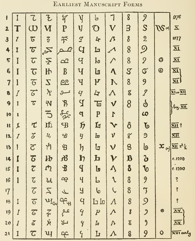 shows many of the earliest forms of the decimal digits after their introduction to Europe. Why it is puzzling is that while the earliest form, from 976 AD, on the top line, shows a clear resemblance to our modern numerals, those below, rather than illustrating a gradual evolution towards the modern form, seem to have, for the most part, gone off into an alien and bizarre direction.