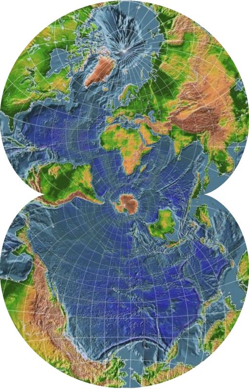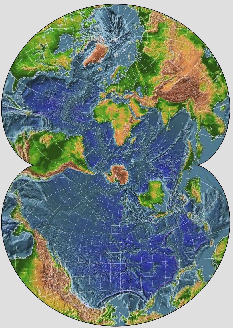 This pictorial version of the August Conformal Projection of the World on a Two-Cusped Epicycloid, created with G.Projector, and using a dataset from NOAA that provides shaded relief for bathymetry as well as topography, as it includes national borders, shows why this projection can't really be used for an ordinary map of the world for mainstream purposes: the exaggeration of scale is such at the edges that the areas in the center of the map must be at quite a small scale relative to the size of the map, compared to almost any other projection.