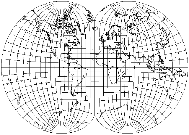 While I could have drawn an outline map in the Eisenlohr projection in that aspect with my own map drawing program, I didn't think that would be all that illuminating. But G.Projector does not support the Eisenlohr projection; which isn't surprising, as it is difficult to invert, being the sum of two component projections.