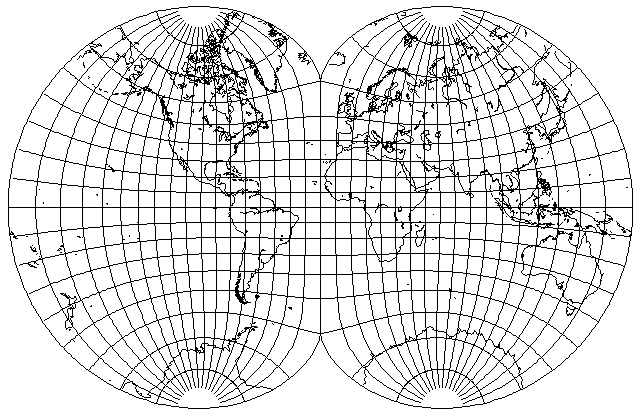 Of course, though, this is not really a particularly good example. While one can achieve a small improvement by going from August's conformal projection to the more mathematically complex Eisenlohr, one can get an even bigger reduction of the distortion of sizes in the map by going to the mathematically simpler Stereographic in the form of two hemispheres: