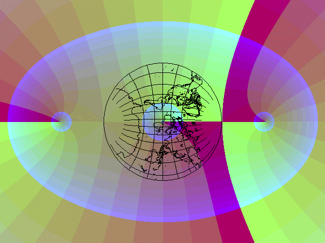 Incidentally, the two terms in the expansions of x and y are each conformal projections in themselves; x = ln(V), y = atan(T) produces a conformal projection in a shape resembling an ellipse with a limited elongation. (However, the shape is unlikely to actually be an ellipse; elliptic integrals, as used for Guyou's projection, to be seen next, are required for that.)