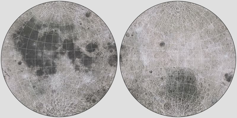 Another case where all parts of the map are equally important, so that the Eisenlohr would be preferred to the August conformal, is for maps of other celestial bodies, such as the Moon or Mars. So here is a map of the Moon on the Eisenlohr projection: