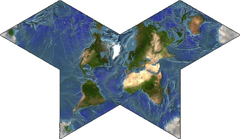 The original Butterfly Map by B. J. S. Cahill is an attractive world map; although I liked it, I felt I could not give it proper coverage on my pages for a number of reasons. However, there is an excellent site dedicated to that projection, and thus providing a link to that resource will be more helpful than any limited mention I could provide on these pages.