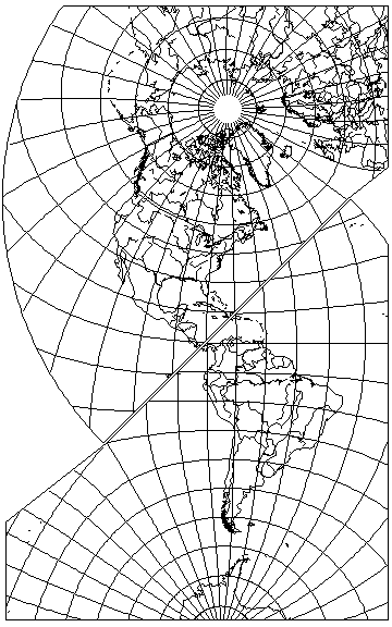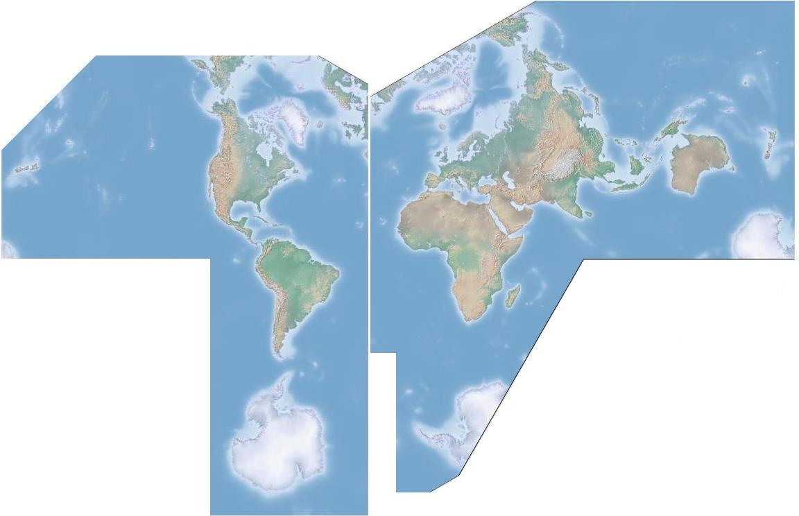 In this form, the general appearance of the projection is reminiscent of that of the Butterfly projection of B. J. S. Cahill, but the world is only divided into two parts, not eight. Incidentally, B. J. S. Cahill was also a noted San Francisco architect, in addition to devising several map projections based on the octahedron; thus, he has more than one thing in common with R. Buckminster Fuller, also an architect, who also developed two polyhedral map projections, one based on the cuboctahedron, and one on the icosahedron.