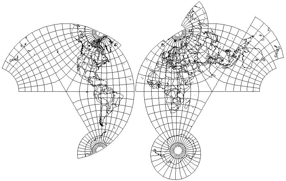 Presumably, the projection could be extended slightly to allow Greenland and Iceland to be kept in one piece, and perhaps even to continue Eurasia up to the Bering Strait; Stereographic inset caps could be used for the Arctic and Antarctic as well; also, the conic projection would only have to be continued, not extended, to split Antarctica into only two halves, instead of four pieces, with the additional advantage of reducing the width of the map.