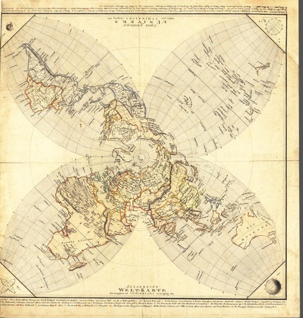 But this map apparently uses the principle of the Globular projection as the basis for those lobes, with 37 degrees North latitude apparently being the boundary between them and the polar azimuthal projection in the center.