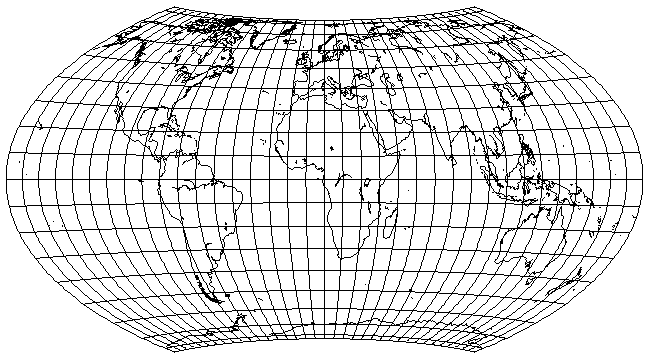 The projection above follows the scheme of the Wagner VII projection, but with different parameters; of the three parameters, one of them is different for the Northern hemisphere and the Southern hemisphere; the other two are the same, so the two projections will join smoothly at the equator.