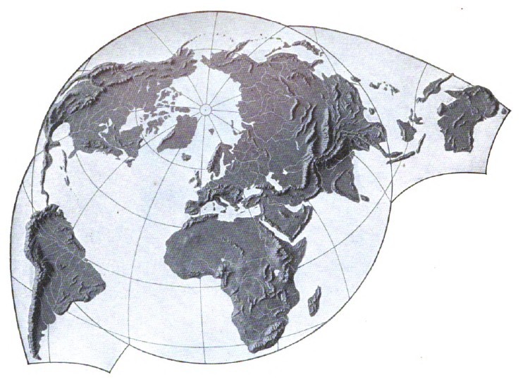 This time, the interruptions of the North Polar Area found in the Kite projection were discarded as unnecessary, but given the large angular range of the projection, this led to considerable shear.