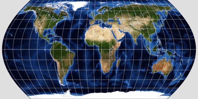 thus making the choice on the part of the National Geographic Society to switch from that to this projection for their regular world maps one in step with the times. (Of course, my personal response to the Robinson projection is along the lines of "What, isn't the Winkel Tripel good enough for you?", but apparently studies have indicated that people prefer projections with straight parallels to those with curved parallels. But then, vertical meridians are also preferred, according to those same studies, which perhaps means that we can't do better than the Miller Cylindrical.)