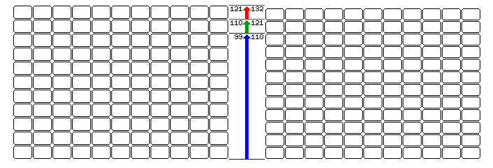 Eleven card heights of 3 1/2 inches makes 38 1/2 inches. Two Tarot card widths of 2 3/4 inches is 5 1/2 inches, and two Tarot card heights of 4 3/4 inches is 9 1/2 inches. As 5 1/2 is eleven times 1/2 inch, 38 1/2 inches will be a multiple of it; so seven pairs of Tarot cards will fit across the width of a sheet.