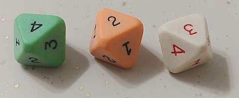 The second image shows three octahedral dice with the numbers from 1 to 4 printed on them twice, thus avoiding the difficulties that the tetrahedral shape presents.