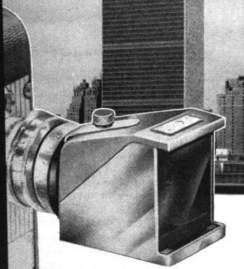 On the other hand, another way to save money when plunging into 3-D photography would be to obtain a 3-D adapter for your existing camera. Such adapters were available for a number of cameras; at left we see one made by Exakta specifically for their own 35mm SLR cameras, which also offered an attachment for the reflex screen allowing the shot to be taken to be viewed in three dimensions.