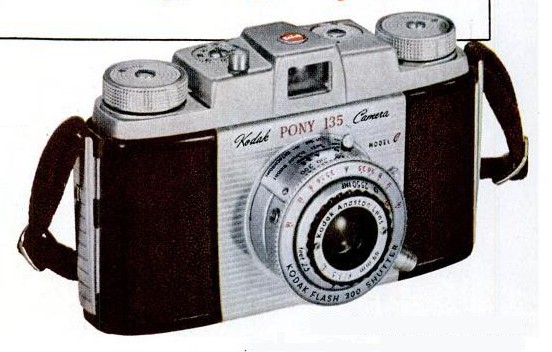 What about the original version of the Kodak Pony 135? It was harder for me to find an advertisement which included a picture of it; I ran across several which, under a picture of the Kodak Pony 828, also mentioned the Pony 135 in passing. However, I did finally come across an advertisement which included the picture shown at right: on the left is the Model A version of the Kodak Pony 135, standing behind a Kodak Pony 828.