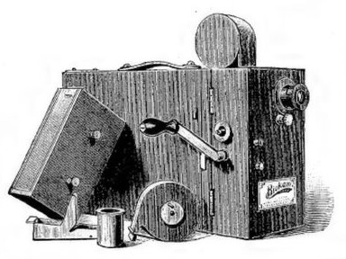 Instead of just mentioning a few random home movie cameras, though, I should get a bit more systematic. As far back as 1899, a 17.5mm film format was introduced to make film-making more economical for amateur movie-makers. This was a British invention, by one Alfred Darling, the Biokam, but soon after, in 1903, the Ernemann Kino used a very similar 17.5 mm film format as well. An engraving of the Biokam from an advertisement is shown at left; the unit actually combined a camera, a projector, and a device for developing the film in a single unit. These film formats made use of a central perforation similar to that of 9.5 mm film. Actually, in 1898 another 17.5 mm film format had been introduced with a format very similar to that of modern 16 mm film for the Birtac by Birt Acres.