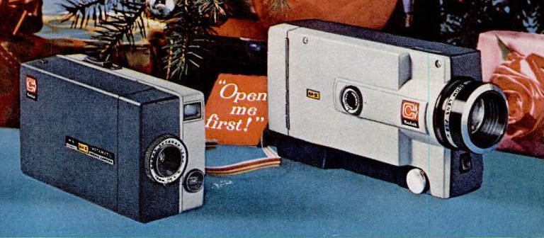 This photograph from an advertisement shows two early Kodak Super 8 cameras, the Kodak Instamatic M4 on the left and the Kodak Instamatic M6, which had the additional feature of a zoom lens, on the right.
