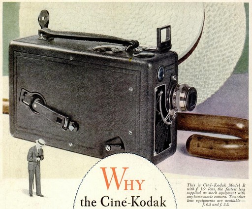 Shown at right is the Ciné-Kodak Eight. This camera was introduced in 1932, marking the introduction by Kodak of 8mm film to make home cinematography more affordable.