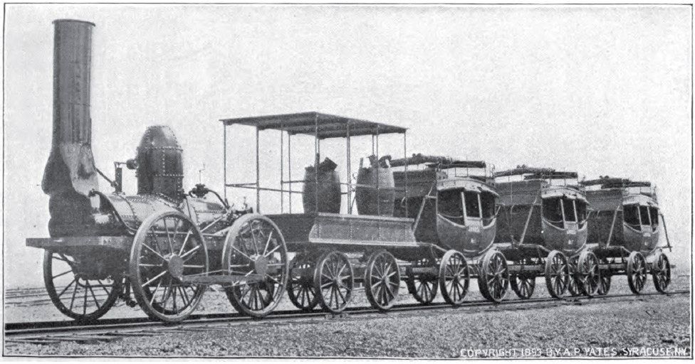 This photograph, from a book about the visit of a Russian prince to the United States, shows the DeWitt Clinton, which was the very first passenger train to operate in the U.S.A., on a route from Albany to Schenectady.