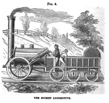 is of the Rocket, which in 1829 was the winner of a competition to find the locomotive to be used by the Liverpool and Manchester Railway. George Stephenson built his first locomotive in 1814; the Rocket was largely designed by his son, Robert Stephenson, but George Stephenson collaborated with him by mail, and other employees of his firm were also involved.