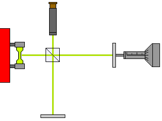 The light enters a beam splitter, the square object with a diagonal line through it in the center of the cross formed by the light beams in the four cardinal directions from it. Half the light goes downwards to the fixed mirror at the bottom of the diagram. The other half continues on leftwards, to a mirror the position of which can be shifted using the barrel of a micrometer.