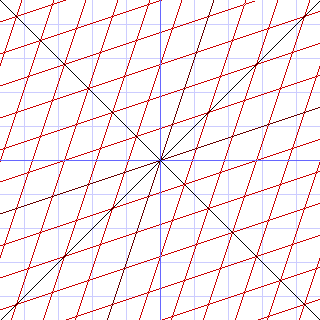 The fact that the speed of light is constant for all observers is shown by the fact that these two lines, whose equations are y=x and y=-x, have these same equations in the coordinate system shown in red, because of the way in which the rhombi of which it is composed are symmetrical about the diagonal axes of the diagram.